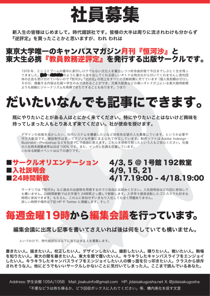 時代錯誤社は、1978年設立の東京大学の文代加盟サークルです。駒場キャンパスの学生会館1階105Aを部室として活動しています。現在の活動の中心は、